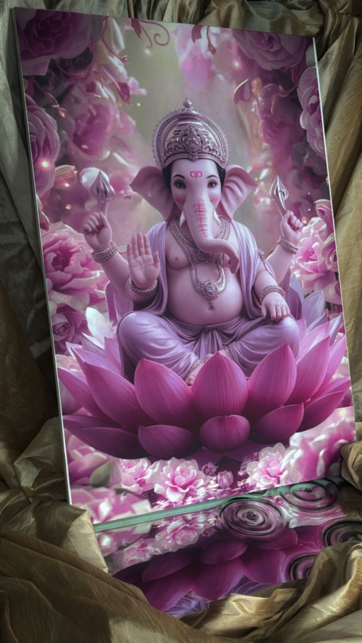 Every panel features an exquisite depiction of Lord Ganesha seated serenely atop a blooming lotus, radiating abundance, wisdom, and positivity. His majestic presence creates an auspicious, uplifting atmosphere in any setting.