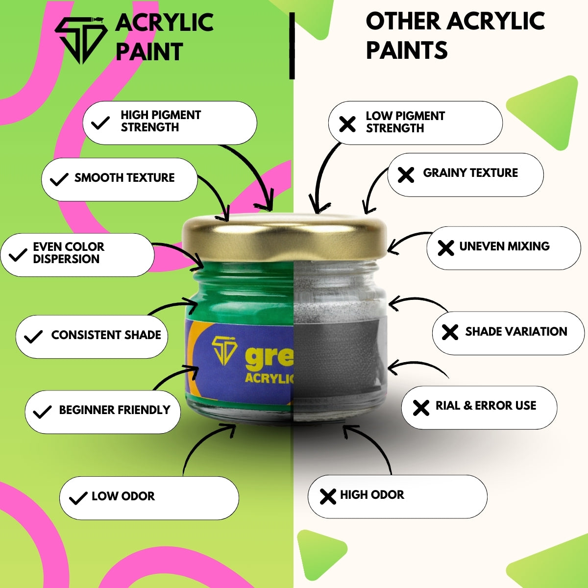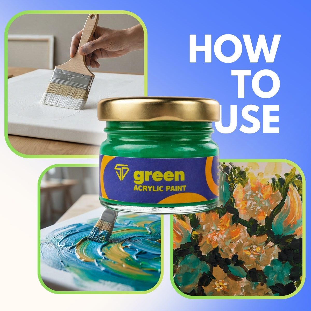 Explore your creativity with our Green Acrylic Paint—designed to deliver rich, consistent color for any art project. This versatile, water-based acrylic paint offers high pigmentation and smooth application, making it perfect for artists of all levels.
